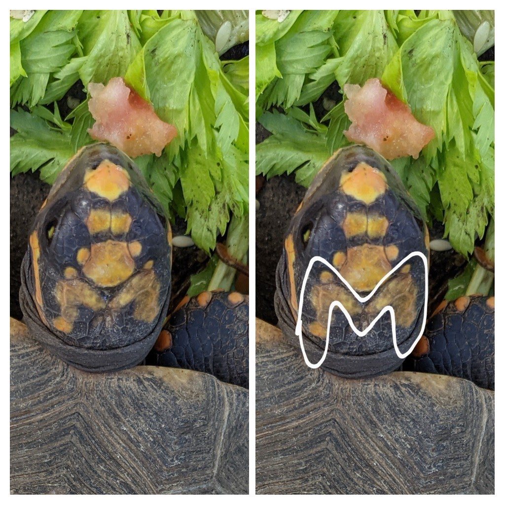 And this tortoise came to us seemingly destined for that name! Notice the large ‘M’ on her head?