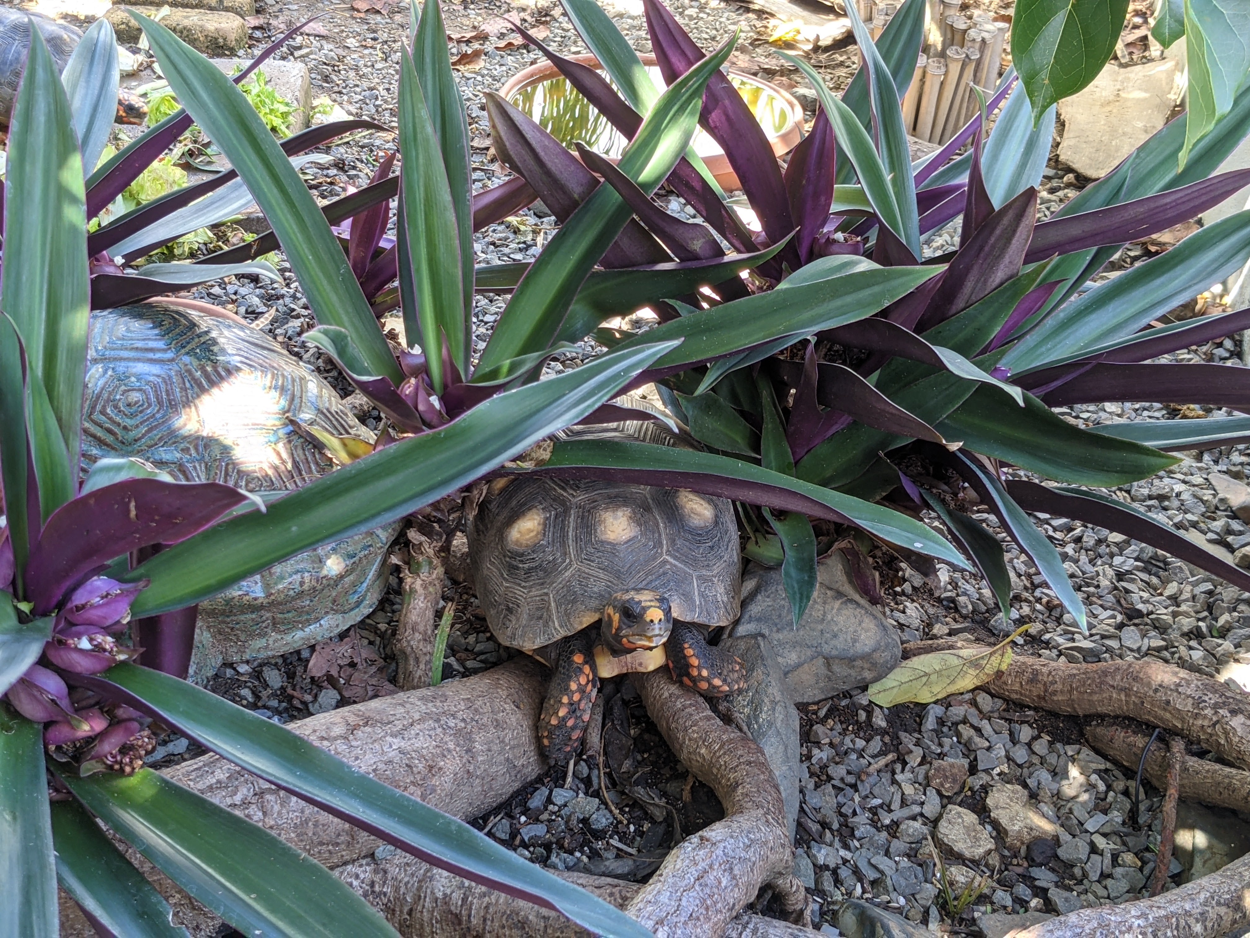 | Marina loves to hide among the oyster plants (the large tortoise on the far left is a ceramic decoration). |