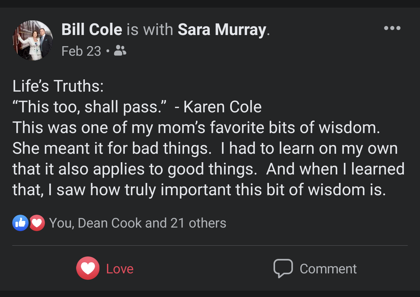 And it is true. Everything in life passes. Even the good stuff. Case in point, on the same day that my brother shared the post above, I shared this post: