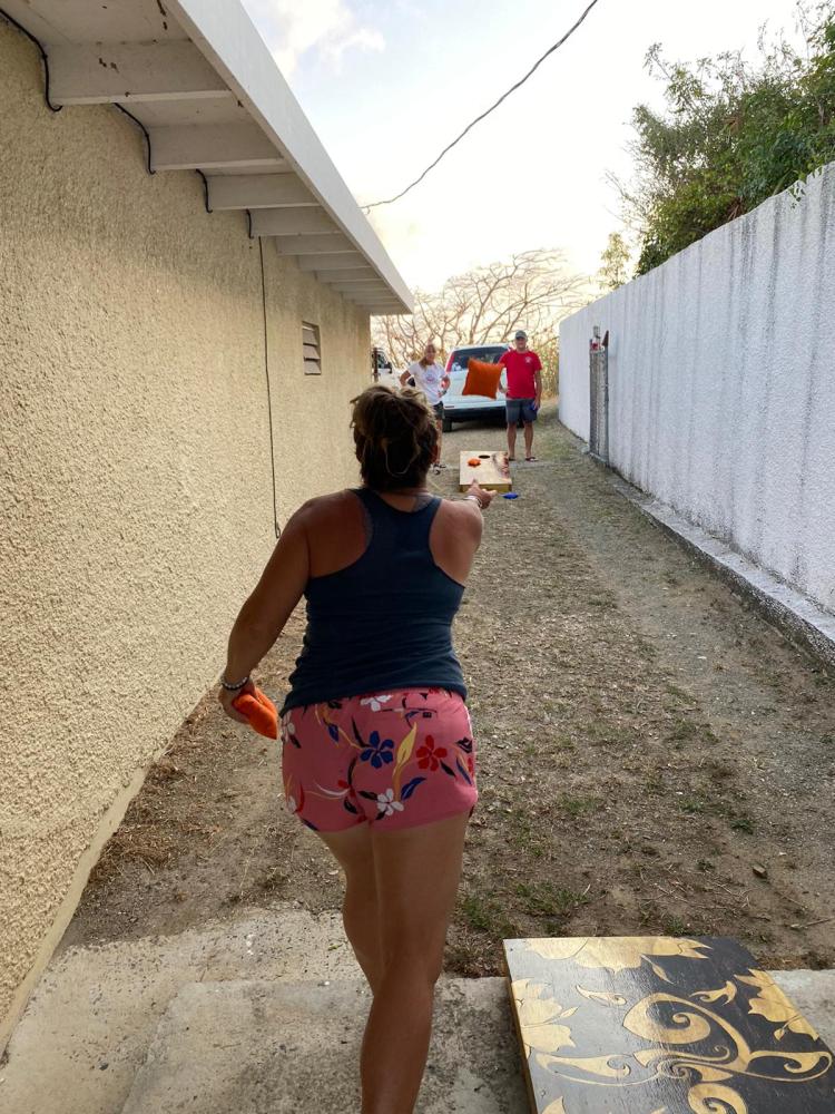 After a short soak in the mini-pool (and 3 wins at dominoes against Dino), we had an impromptu game and grill night with friends. We played cornhole on our new set of boards, and ring toss. We chatted and laughed and had a great time.